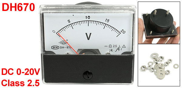Product Name Analog Voltmeter Model DH670 Measuring Range DC 0-20V Accuracy Class 2.5 Meter Face Size(Approx) 6.5 x 6cm/ 2.6" x 2.3" (L*W) Thread Size 0.28 x 0.75cm / 0.11" x 0.30" (D*L)
