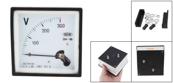 Product Name Analog Voltmeter Model DH96 Measuring Range AC 0-300V Accuracy Class 1.5 Meter Face Size(Approx) 95 x 95 x 50mm / 3.7" x 3.7" x 1.97" (L*W*T) Thread Size 4.8 x 8mm/ 0.19" x 0.3" (D*L)