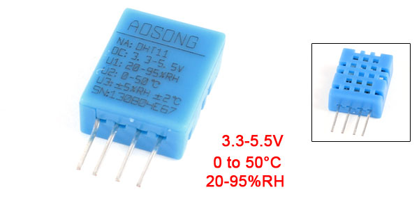 Product Name Digital Temperature Humidity Sensor Module Model DHT11 Power 3.3-5.5V Measures Temperature Range 0 to 50°C Humidity Range 20-95%RH Pin Quantity 4 Pin Length 7mm / 0.27" Pin Pitch 2mm / 0.08" Total Size 2.1 x 1.7 x 0.5cm/1.8" x 0.6" x 0.02"(L*W*H) Material Plastic, Electronic Part Color Blue Net Weight 1g Package 1 x Digital Temperature Humidity Sensor Module - Reviews