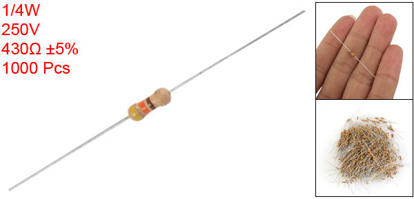 Product Name Carbon Film Resistor Quantity 1000±2% Pcs Withstand Voltage 250V Rated Power 1/4W Resistance Value 430Ω Tolerance ±5% Lead Diameter(Approx.) 0.3mm/0.01 Body Dimension 5 x 2mm/0.19" x 0.07"(L*D)