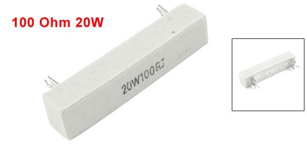 Product Name Cement Resistor Body Material Cement Power 20W Resistance 100Ω Tolerance ±5% (G) Body Size (Approx.) 61 x 13 x 11mm/2.4" x 0.51" x 0.43" (L * W * H) Lead Diameter(Approx.) 1.3mm/0.05" Color White Weight 21g Package Content 1 x Cement Resistor - Reviews