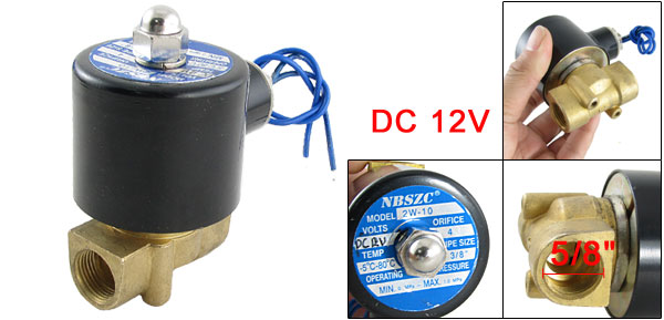 Product Name Solenoid Valve Model 2W-040-10 Type 2 Way 2 Position NC Material Metal Voltage DC 12V Working Temperature -5 ~ 80 Centigrade Degree CV Value 0.6 Operating Pressure Min. 0- Max. 1 Mpa Bore Diameter 3/8" Female Thread Dia 4mm / 5/32", 16mm / 5/8" Cable Length 15cm/5.9" Total Size (Approx.) 8.3 x 6.5 x 4.6cm / 3.3" x 2.6" x 1.8" (L*W * T) Color As Picture Shown Weight 569g Package Content 1 x Solenoid Valve - Reviews
