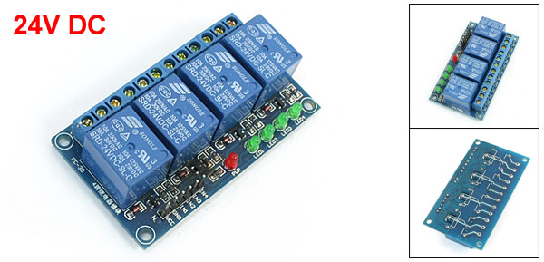 Product Name Relay Module Model SRD-24VDC-SL-C Number of Channels 4 Coil Voltage 24V DC Contact Capacity 10A, AC 250V/125V, DC 30V/28V Size 7.3 x 4 x 2cm/2.9" x 1.6" x 0.78"(L*W*H) Material PCB Color Blue Weight 64g Package 1 x Relay Module - Reviews