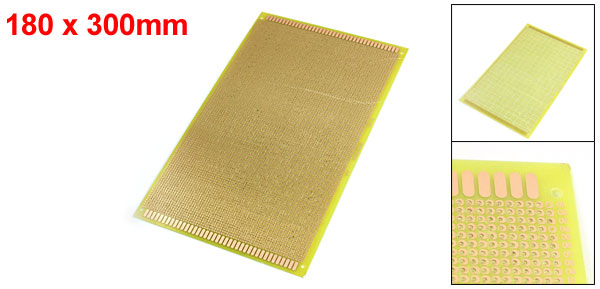 Product Name Universal PCB Board Hole Dia(Approx) 1mm / 0.039" Hole Pitch(Approx) 2.54cm / 0.1" Size(Approx) 180 x 300mm / 7.1" x 11.8"(W*L) Thickness(Approx) 1.1mm / 0.043" Material FR-4 Color Copper Tone Net Weight 100g Package Content 1 Pcs x Universal PCB Board - Reviews