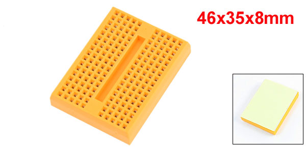 Product Name Solderless Breadboard Color Yellow Size 46 x 35 x 8mm / 1.8" x 1.4" x 0.31" (L*W*T) Material Plastic, Foam, Electronic Components Connector Aquantity 170 Pcs Net Weight 14g Package Content 1 x Solderless Breadboard - Reviews