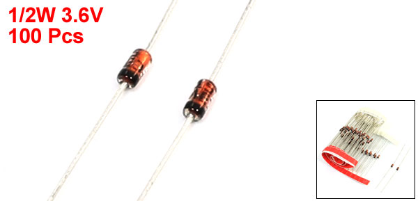 Product Name Zener Diodes Rating Power 1/2W Zener Voltage 3.6V Size(Not Include Leads) 3.6 x 1.8mm/ 0.15" x 0.1" (L*D) Leads Dia(Approx) 0.4mm/ 0.0315" Overall Length(Approx) 60mm/ 2.5" Weight 14g Package Content 100(±2%) x Zener Diodes - Reviews