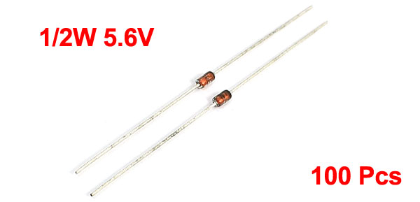 Product Name Zener Diodes Rating Power 1/2W Zener Voltage 5.6V Size(Not Include Leads) 4 x 2mm/ 0.16" x 0.08" (L*D) Leads Dia(Approx) 0.5mm/ 0.008" Overall Length(Approx) 60mm/ 2.4" Weight 13g Package Content 100(±2%) x Zener Diodes - Reviews