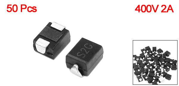Product Name Rectifier Diode Model S2G Package Type DO-214AA Max Repetitive Peak Reverse Voltage 400V Max Average Forward Rectified Current 2A Size 5.5 x 3.7 x 3mm / 0.22" x 0.15" x 0.12" (L*W*T) Color Silver Tone, Black Weight 10g Package Content 50 (±2%) x Rectifier Diode - Reviews