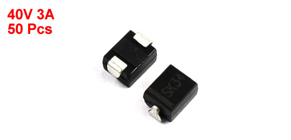 Product Name Schottky Diode Model SK34 Package Type DO-214AA Max Repetitive Peak Reverse Voltage 40V Max Average Forward Rectified Current 3A Size 5.5 x 3.7 x 3mm / 0.22" x 0.15" x 0.12" (L*W*T) Color Silver Tone, Black Weight 10g Package Content 50 (±2%) x Schottky Diode - Reviews