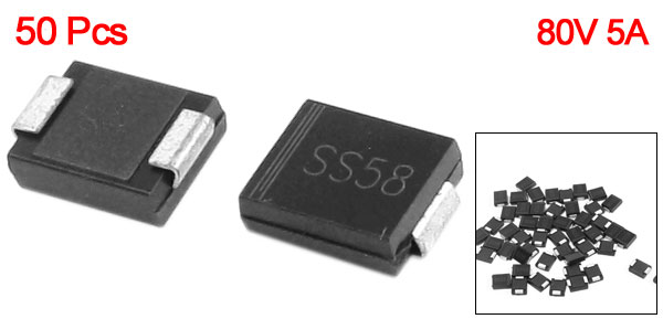 Product Name Schottky Diode Model SS58-C Package Type DO-214AB Max Repetitive Peak Reverse Voltage 80V Max Average Forward Rectified Current 5A Size 7.5 x 5.7 x 2.4mm / 0.3" x 0.23" x 0.09" (L*W*T) Color Silver Tone, Black Weight 15g Package Content 50 (±2%) x Schottky Diode - Reviews