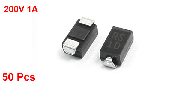 Product Name Fast Recovery Rectifier Diode Model RS1D Package Type DO-214AC (SMA) Max Repetitive Peak Reverse Voltage 200V Max Average Forward Rectified Current 1A Size 5 x 2.5 x 2.2mm / 0.2" x 0.1" x 0.087" (L*W*T) Color Silver Tone, Black Weight 10g Package Content 50 (±2%) x Fast Recovery Rectifier Diode - Reviews