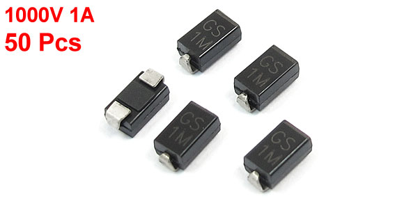 Product Name Rectifier Diode Model GS1M Package Type DO-214AC Max Repetitive Peak Reverse Voltage 1000V Max Average Forward Rectified Current 1A Size 5 x 2.5 x 2.2mm / 0.2" x 0.1" x 0.087" (L*W*T) Color Silver Tone, Black Weight 6g Package Content 50 (±2%) x Rectifier Diode - Reviews