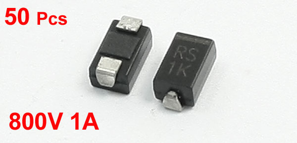 Product Name Fast Recovery Rectifier Diode Model RS1K Package Type DO-214AC (SMA) Max Repetitive Peak Reverse Voltage 800V Max Average Forward Rectified Current 1A Size 5 x 2.5 x 2.2mm / 0.2" x 0.1" x 0.087" (L*W*T) Color Silver Tone, Black Weight 10g Package Content 50 (±2%) x Fast Recovery Rectifier Diode - Reviews