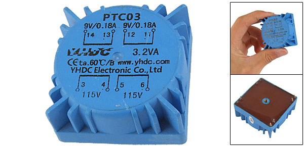 Product Name Encapsulated Transformer Model PTC03 Power 3.2VA Primary 3-4/5-6, 115V x 2 Secondary 14-13/12-11, 9V/0.18A x 2 Pins Number 8 Grade B Working Temperature 60 Celsius Degree Total Size(Approx.) 4.5 x 4.4 x 2.4cm/1.8'' x 1.7'' x 0.9'' (L*W*H) Thread Dia. 0.3cm/0.12'' Color Blue Weight 116g Package Content 1 x Encapsulated Transformer - Reviews