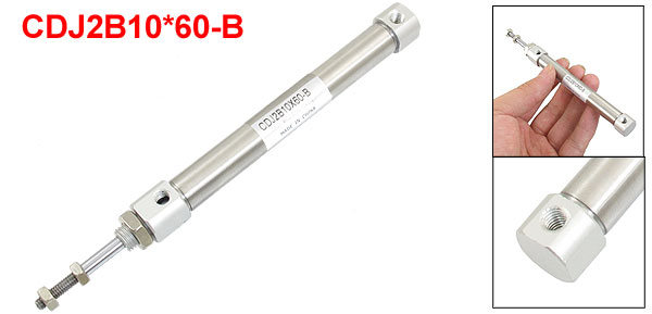 Product Name Air Cylinder Model CDJ2B10*60-B Action Double Action Rod Type Single Rod Bore 10mm/ 25/64" Stroke 60mm/ 2 4/11" Piston Rod Hex Size 7mm/ 0.28" Piston Rod Thread Diameter 4mm/ 0.16" Piston Rod Thread Length 10mm/ 0.39 Thread Diameter 8mm/ 0.31" Thread Hole Diameter 4.5mm/ 0.18" Max Press 1.0 Mpa Overall Size(Approx) 134 x 14mm/ 5.3" x 0.6"(L*Max Dia.) Material Stainless Steel, Aluminum Color Silver Tone Weight 37g Package Content 1 x Air Cylinder - Reviews
