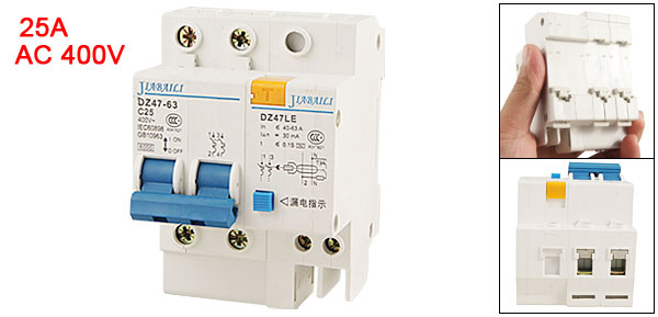 Product Name Earth Leakage Circuit Breaker Model DZ47-63 C25 Rated Current 25A Rated Voltage AC 400V Rated Circuit Breaking Capacity 6000A Mount Type 35mm DIN Rail Total Size (Approx.) 77 x 62 x 71mm/ 3" x 2.4" x 2.8" (L*W*H) Number of Poles 2 Material Plastic, Electric Components Color As Picture Shown Weight 278g Package Content 1 x Earth Leakage Circuit Breaker - Reviews