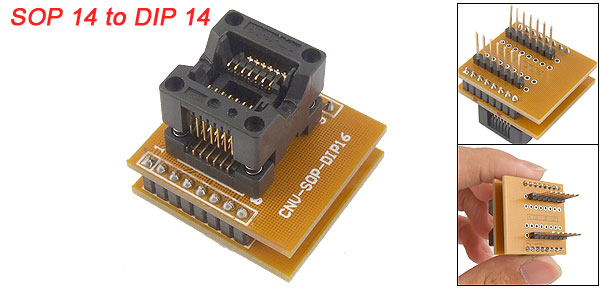 Product Name IC Programmer Adapter Type SOP 14 to DIP 14 Material Plastic, Metal Pin Number 14 DIP Pin Pitch 2.54mm/0.1'' SOP Pin Pitch 1.27mm/0.05'' Total Size 31 x 29 x 36mm/1.2'' x 1.1'' x 1.4'' (L*W*H) Color Black, Orange Weight 14g Package Content 1 x SOP 14 to DIP 14 Programmer Adapter - Reviews