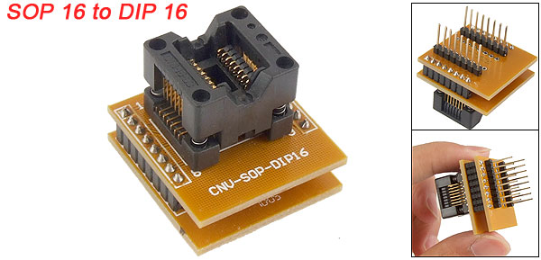 Product Name IC Programmer Adapter Type SOP 16 to DIP 16 Material Plastic, Metal Pin Number 16 DIP Pin Pitch 2.54mm/0.1'' SOP Pin Pitch 1.27mm/0.05'' Total Size 31 x 29 x 36mm/1.2'' x 1.1'' x 1.4'' (L*W*H) Color Black, Orange Weight 15g Package Content 1 x SOP 16 to DIP 16 Programmer Adapter - Reviews