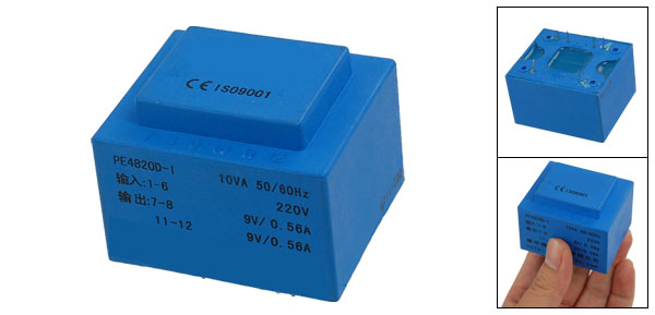 Product Name Encapsulated Transformer Model No. PE4820D-I Primary Work Voltage 220V Work Frequency 50-60Hz Insulation Grade Grade B Power 10VA Primary Pin 1-6 Secondary Pin 7-8/ 11-12 Secondary Full-load Voltage 2 x 9V Secondary No-load Voltage 2 x 10.9V Secondary Output Current 560mA x 2 Mounting Height 38mm/1.5" Number of Pins 6 Pin Length 7mm/ 0.27" Pin Diameter 0.8mm/ 0.031" Overall Size(Approx.) 51 x 43 x 45mm/ 2" x 1.7" x 1.8" (L*W*H) Material Epoxy Resin Color Blue Weight 332g Package Content 1 x Encapsulated Transformer - Reviews