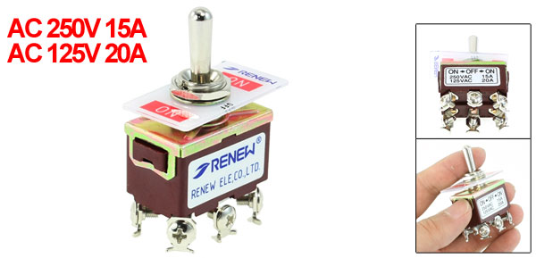 DetailsDPDT ON-OFF-ON 3 Position 6-Terminal Toggle Switch AC 15A/250V 20A/125V  Product Name Toggle Switch Type DPDT (ON/OFF/ON) Position 3 Voltage Current AC 250V 15A AC 125V 20A Mounting Thread Diamter 12mm / 0.5" Main Body Size 3.1 x 1.9 x 2cm/ 1.2" x 0.7" x 0.8" (L*W*H) Overall Height 55mm / 2.2" Material Metal, Plastic Net Weight 36g Package Content 1 x Toggle Switch