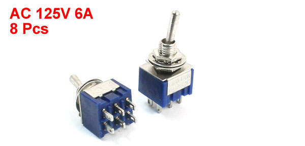 Product Name Toggle Switch Type DPDT (Latching) Position 3 Positions (ON/OFF/ON) Voltage, Current AC 125V 6A Mounting Thread Diameter 6 mm / 0.24" Main Body Size 13 x 11 x 9mm / 0.5" x 0.43" x 0.35" (L*W*H) Overall Height 3cm / 1.2" Color Blue, Silver Tone Net Weight 50g Package Content 8 x Toggle Switch - Reviews