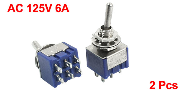Product Name Toggle Switch Type DPDT (Latching) Position 2 Positions (ON/ON) Voltage, Current AC 125V 6A Mounting Thread Diameter 6 mm / 0.24" Main Body Size 13 x 11 x 9mm / 0.5" x 0.43" x 0.35" (L*W*H) Overall Height 3cm / 1.2" Color Blue, Silver Tone Net Weight 12g Package Content 2 x Toggle Switch - Reviews