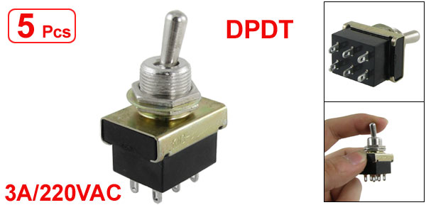 Product Name Toggle Switch Type DPDT (ON/ON) Position 2 Mounting Hole Diamter 11.7mm / 0.456" Voltage & Current 3A/220VAC Main Body Size 25 x 18 x 14.8mm / 0.98" x 0.7" x 0.58"(L*W*H) Overall Height 43mm / 1.7" Material Metal & Resin Color As Picture Shown Weight 81g Package Content 5 x Toggle Switch - Reviews