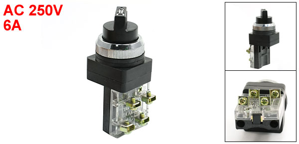 Product Name Push Button Switch Contact Type 1NO 1NC, DPST Action Type Latching Rotary Selector Position of Number 2 Position Ui 600V Rate Voltage & Current AC 250V 6A Terminal Quantity 4 Panel Cutout Diameter 22mm / 0.87" Fit Panel Max. Thickness 6mm / 0.24" Total Size(Approx) 3.5 x 3 x 8.6cm / 1.4" x 1.2" x 3.3" (L*W*H) External Material Plastic, Metal Color Black, Silver Tone Net Weight 60g Package Content 1 x Push Button Switch - Reviews