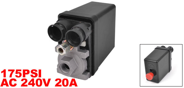 Product Name Air Compressor Pressure Switch Type 4 Ports DPST Max. Voltage AC 240V Current 20A Pressure 175 PSI, 12 Bar Inlet Thread Dia 11mm/1/4PT Hole Dia.(Black) 16mm/ 0.6" Hex Head Hole (Brass Tone) 6mm/0.24" Total Size 13 x 8 x 5cm/5.1" x 3.1" x 2" (L*W*T) Button Diameter 2cm/ 0.8" Material Metal, Plastic Main Color Black, Red Net Weight 280g Package Content 1 x Air Compressor Pressure Switch - Reviews