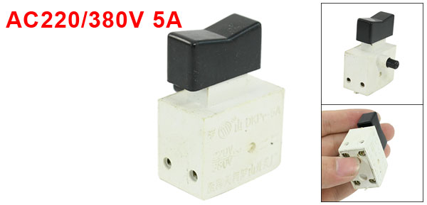 Product Name Electric Tool Switch Model No. DKP1-5A Action Type DPST, NO Lock Type Lock ON Technical Parameter 220V/380V , 5A Pillar Terminal Type M3 (3mm diameter) Size 4.1 x 2.5 x 5cm/ 1.6" x 1" x 2" (L*W*H) Material Plastic Color Off White, Black Weight 25g Package 1 x Electric Tool Switch - Reviews