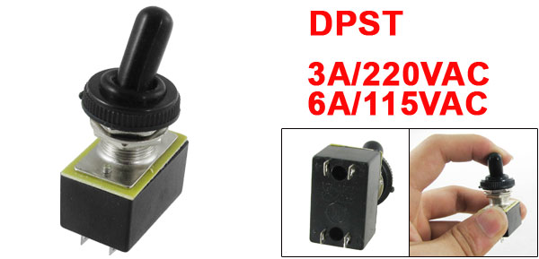 DetailsDPST ON/OFF 2 Position 4 Pin Toggle Switch 6A/115VAC 3A/220VAC  Product Name Toggle Switch Type DPST (ON/OFF) Position 2 Mounting Hole Diamter 11.7mm / 0.46" Voltage & Current 3A/220VAC 6A/115VAC Main Body Size 28 x 17.6 x 16mm / 1.1" x 0.69" x 0.63"(L*W*H) Overall Heigh 54mm / 2.4" Material Metal, Resin & Rubber Color As Picture Shown Weight 22g Package Content 1 x Toggle Switch
