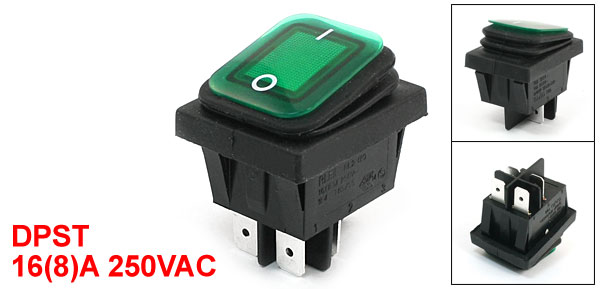 DPST On-Off Green Lamp Waterproof Car Boat Rocker Switch 16(8)A 250VAC