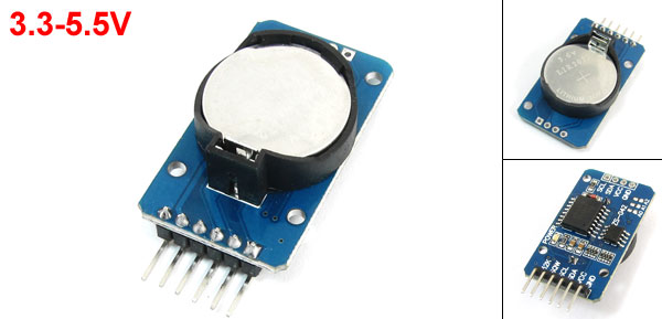 Product Name DS3231 Clock Module Model DS3231 Working Voltage 3.3-5.5V Battery Power LIR2032 Button Battery(Here not Include) Pin Pitch 2mm Total Size 44 x 22 x 17 mm / 1.7" x 0.87" x 0.67" (L*W*H) Mounting Hole Dia. 2mm/ 0.08" Cable Length 16cm / 6.3" Material Plastic, Iron, PCB Color Blue Weight 4g Package Content 1 x DS3231 Clock Module