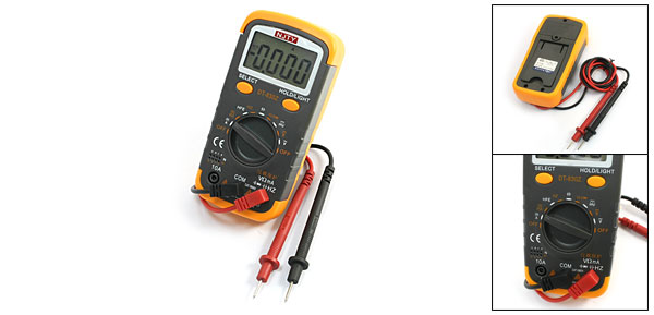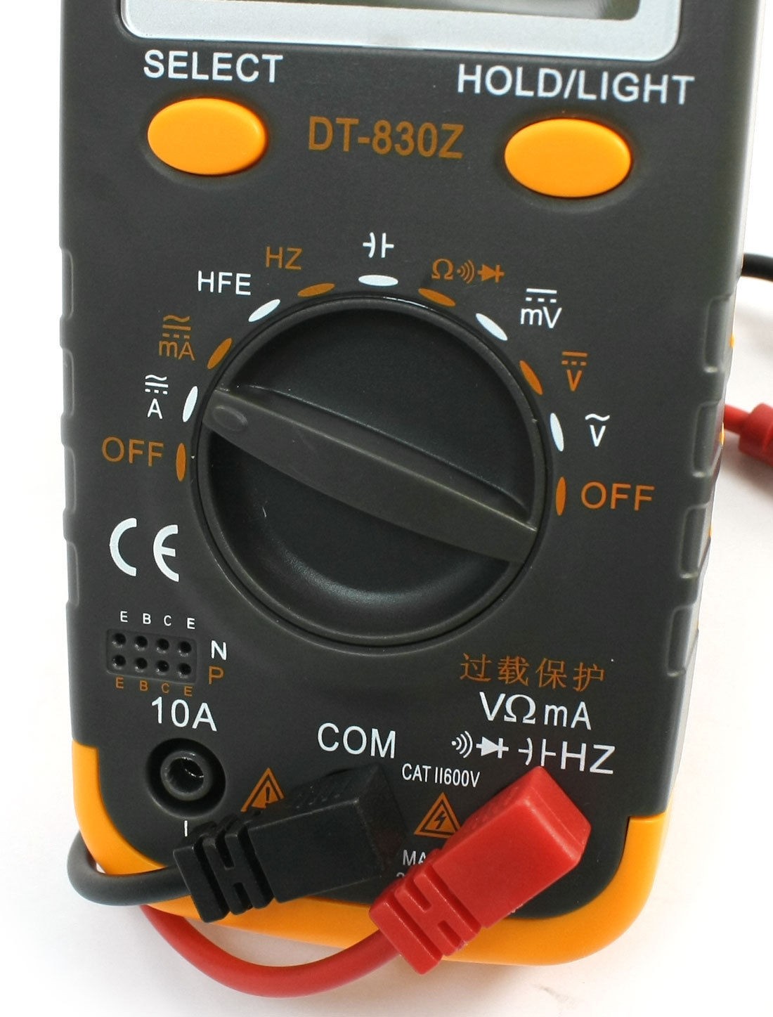 Product Name Digital Multimeter Model DT-830Z AC Current 40mA/200mA/4A, ±(2%+3)10A, ±(3%+5)AC Voltage 200V/600V, ±(1.2%+10) DC Voltage 200mV/2V/20V/200V/600V, ±(0.5%+5) Resistance Rx400/Rx4K/Rx40K/Rx400K/Rx4M, 40M, ±(1.2%+5) Frequency40Hz/400Hz/4KHz/40KHz/4MHz/20MHz, ±(0.5%+3) Capacitance 40nF/400nF/4uF/40uF/100uF, ±(3%+5)Power Supply 1 x 9V Batteries(Not Included Here) Clamp Meter Size 14.8 x 7.2 x 3.6cm/ 5.8" x 2.8" x 1.4"(L*W*T) Mateiral Plastic, Electronic Parts Main Color Iron-gray, Orange Total Weight 294g Package Content 1 x Digital Multimeter
