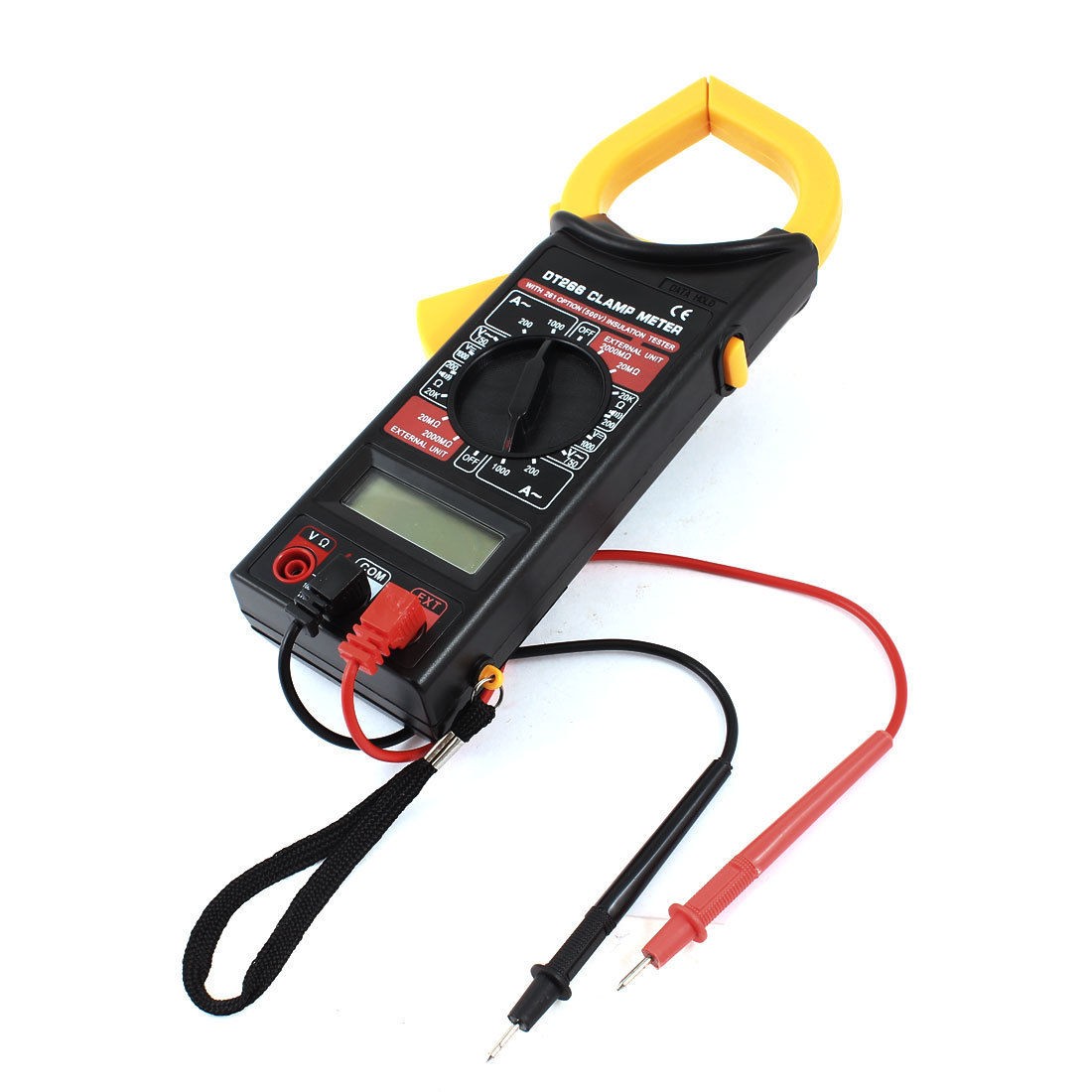 Product Name Multitester Model DT266 DC Voltage 1000V AC Voltage 750V AC Current 200A 1000A Resistance(Ohm) 200Ω 20KΩ 20MΩ 2000MΩ Battery Powered 9V(6F22) Main Color Yellow, Black Mateiral Plastic, Electronic Parts Cable Length 66cm / 26" Size 24.5 x 9.5 x 3.5cm / 9.6" x 3.7" x 1.4"(L*W*T) Weight 353g Package Content 1 x Multitester