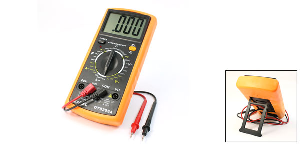 Product Name Digital Multimeter Model No. DT9205A AC Voltage 2V, 20V, 200V, 750V DC Voltage 200mV, 2V, 20V, 200V,1000V DC Current 20uA, 2mA, 200mA, 20A AC Current 2mA, 200mA, 20A Resistance(Ohm) 200, 2k, 20k, 200k, 2M, 20M Capacitance 20nF, 2nF, 20nF, 200nF Power By 1 x 9V Battery (not included) Main Color Black, Orange External Mateiral Plastic Test Leads Total Length 62cm / 24.4"