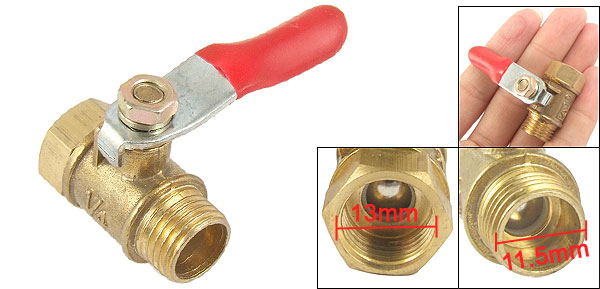 Product Name Full Port Ball Valve Thread Diameter Female: 13mm/0.51'' Male: 11.5mm/0.45'' Ball Hole Diameter 6mm/0.24'' Length 30mm/1.18'' Level Handle Size 45 x 11mm/1.77'' x 0.43'' (L*W) Total Size 55 x 17 x 28mm/2.2'' x 0.7'' x 1.1'' (L*W*H) Color Gold Tone & Red Material Metal Weight 29g Package 1 x Full Port Ball Valve - Reviews