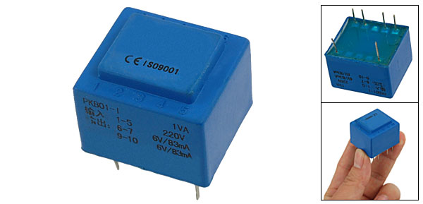 Product Name Encapsulated Transformer Model No. PKB01-I Primary Work Voltage 220V Work Frequency 50-60Hz Insulation Grade Grade B Power 1VA Primary Pin 1-5 Secondary Pin 6-7/ 9-10 Secondary Full-load Voltage 2 x 6V Secondary No-load Voltage 2 x 8.1V Secondary Output Current 83mA x 2 Mounting Height 23.5mm/ 0.93" Number of Pins 6 Pin Length 9mm/ 0.35" Pin Diameter 0.8mm/ 0.031" Overall Size(Approx.) 30 x 28 x 42mm/ 1.2" x 1.1" x 1.7" (L*W*H) Material Epoxy Resin Color Blue Weight 70g Package Content 1 x Encapsulated Transformer - Reviews