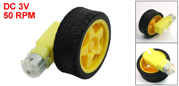 Product Name DC Geared Motor Rated Voltage DC 3V Rated Current 30mA ( no load ) Speed 50 RPM Plastic Tire Wheel Size 65 x 26mm/ 2.6" x 1" (D*H) Motor Size 64 x 22 x 22mm/ 2.5" x 0.87" x 0.87"(L*W*T) Main Color White, Yellow, Silver Tone, Black Material Metal Weight 62g Package 1 x DC Geared Motor w Plastic Tire Wheel - Reviews