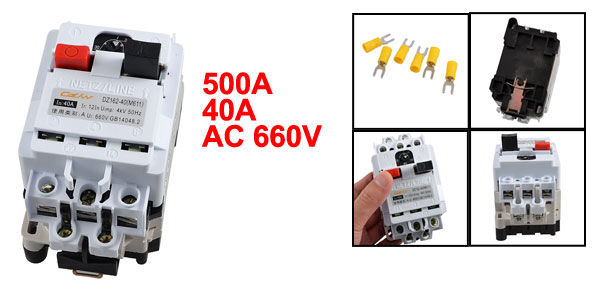 Product Name Circuit Breaker Model Number DZ162-40(M611) Rated Circuit Breaking Capacity 500A Rated Current 40A Rated Voltage AC 660V Instantuneous Release Type 1NO 1NC Number of Poles 3 Overall Size (Approx.) 11 x 6 x 8.6cm/ 4.3" x 2.4" x 3.4"(L*W*H) Material Plastic, Electric Components Color White, Black Net Weight 400g Package Content 1 x Circuit Breaker - Reviews
