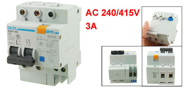Product Name Earth Leakage Circuit Breaker Model DZ47-63 Rated Voltage AC 240/415V Rated Current 3A Number of Poles 2 Rated Breaking Capacity 6000A Rated Residual Operating Current 0.03A (30mA) Rated Residual Operating Time < 0.1S Mount Type DIN Rail Overall Size 9.3 x 6.5 x 6.2cm/ 3.6" x 2.5" x 2.4" (L*W*H)
