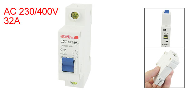 Product Name Miniature Circuit Breaker Model Number DZ47-63 C 32 Rated Circuit Breaking Capacity 6000A Rated Voltage AC 230/400V Rated Current 32A Poles 1 Pole Rail Mounting 35mm DIN Rail Overall Size (Approx) 66 x 18 x 77mm/ 2.6" x 0.7" x 3" (L*W*T ) Material Plastic, Electric Components Color Off White Weight 94g Package Content 1 x Miniature Circuit Breaker - Reviews