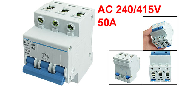 Product Name Circuit Breaker Model Number DZ47-63 C50 Rated Circuit Breaking Capacity 4500A Rated Current 50A Rated Voltage 240/415VAC Number of Poles 3 Mounting Type DIN Dail Total Size (Approx) 66 x 53 x 78mm/ 2.6" x 2.1" x 3.1" (L*W*H) Material Plastic, Electric Components Color As Picture Shown Weight 257g Package Content 1 x Circuit Breaker - Reviews