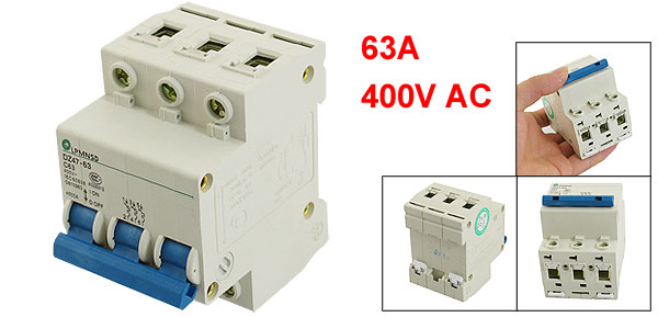 Product Name Circuit Breaker Model Number DZ47-63 C63 Rated Circuit Breaking Capacity 4500A Rated Current 63A Rated Voltage 400VAC Number of Poles 3 Mounting Rail Size 35mm DIN Dail Total Size (Approx) 7.6 x 5.4 x 7.7cm/ 3" x 2.1" x 3" (L*W*H) Material Plastic, Electric Components Color As Picture Shown Weight 240g Package Content 1 x Circuit Breaker - Reviews