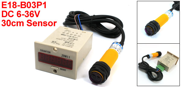Product Name Photoelectric Sensor Switch w Counter Counter Model JDM11-6H Sending Light Infrared Rays Model E18-B03P1 Detection Way Diffuse Type Output Form 3 Wires Voltage DC 6-36V Output State NO, PNP Current 300mA Sensory Distance 30cm Sensor Head Diameter 1.7cm/0.7" Sensor Body Size 6.9 x 1.8cm/2.7" x 0.7"(L*Max.D) Counter Size 9 x 5.6 x 4cm/3.5" x 2.2" x 1.6"(L*W*H) Material Plastic Color Gray, Orange, Black Cable Length 104cm /41" Weight 100g Package Content 1 x Photoelectric Sensor Switch w Counter - Reviews