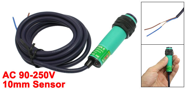 Product Name Inductive Proximity Switch Model E18-DS10KA Theory Inductive Type Sensor Wire Type 2 Wire Type (Brown, Blue) Switch Appearance Type Cylinder Type Output Type NO Detecting Distance 10mm Supply Voltage AC 90-250V Current Output 400mA Total Size 70 x 24mm / 2.8" x 0.94" (L*Max.D) Cable Length 1.1m / 43" External Material Plastic, Metal Net Weight 86g Color Black, Silver Tone, Blue Package Content 1 x Inductive Proximity Switch - Reviews