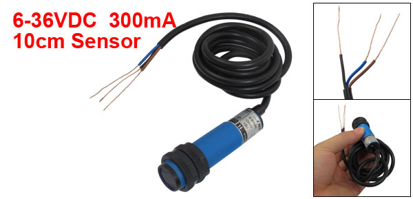 Product Name Photoelectric Switch Sending Light Infrared Rays Model E18-DS10NA Detection Way Diffuse Type Output Type NPN NO 3 Wires Working Voltage 6-36VDC Output Current 300mA Current Consumption 5mA-30mA Sensory Distance 10cm Detected object Type Transparent or Opaque Head Dia. 17mm / 0.67" Mounting Thread Dia. 18mm / 0.7" Body Size(Approx) 6.9 x 2.4cm / 2.7" x 0.9" (L*D Max) Cable Length(Approx) 1.3m / 51" External Material Plastic ABS Main Color Blue, Black Weight 56g Package Content 1 x Photoelectric Switch - Reviews