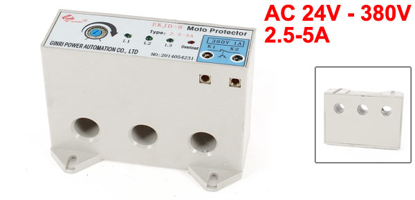 Product Name Motor Protector Type EKJD-8 Reset Time 60 ± 10s Work Mode Uninterrupted Work Mode Applicable Voltage AC 24V - 380V / 45 ~ 60 Hz Current Adjustment Scope 2.5-5A Applicable Motor Power 1.5 - 2.5KW Wire Hole Dia. 11mm/0.43" Control Current of Output Interface 1A/380Vac Environment Temperature -10C - +50C Relative Humidity <=90% Atmospheric Pressure 80Kpa~110Kpa Altitude no more than 200m Total Size 9.2 x 6.3 x 4.2cm/3.6" x 2.5" x 1.7"(L*W*H) Weight 170g Package Content 1 x Motor Protector