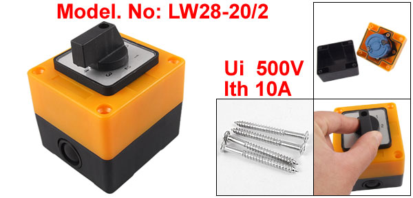 Product Name Changeover Cam Switch Model.No LW28-20/2 Number of Poles 2 Posiotion Quantity 5 Terminals Quantity 8 Ue 380V, 220V Ui 500V Ith 10A Ie AC-15: 0.95A, 1.6A DC-13: 0.14A AC-3: 5A Handle Size 3.5 x 0.9cm / 1.37" x 0.35"(L*W)