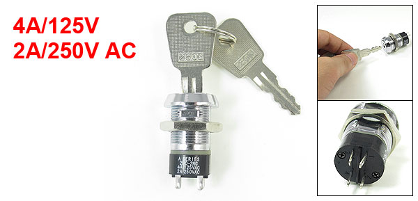 Product Name Keylock Switch Voltage & Current 4A / 125V AC, 2A / 250V AC Contact Type 1NO 1NC Thread Dia(Approx) 18mm / 0.71" Overall Size(Approx) 2.5 x 4cm / 0.98" x 1.6"(Max. W * L) Color Silver Tone, Black Material Zinc Alloy, Plastic Net Weight 50g Package Content 1 x Keylock Switch